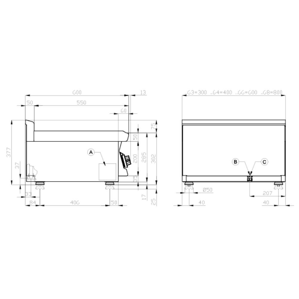 Olaszországban gyártott, nagykonyhai használatra tervezett 2 zónás, 1/2 bordázott + 1/2 sima felületű, asztali, elektromos rostlap, lapsütő, szeletsütő rozsdamentes acélból, 2,5 mm vastag munkalappal, IPX5 védelemmel.