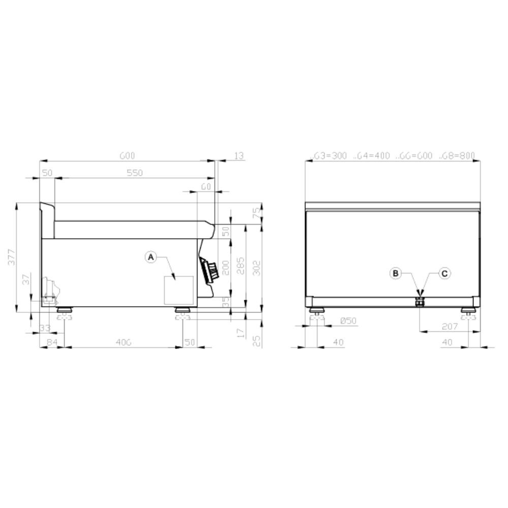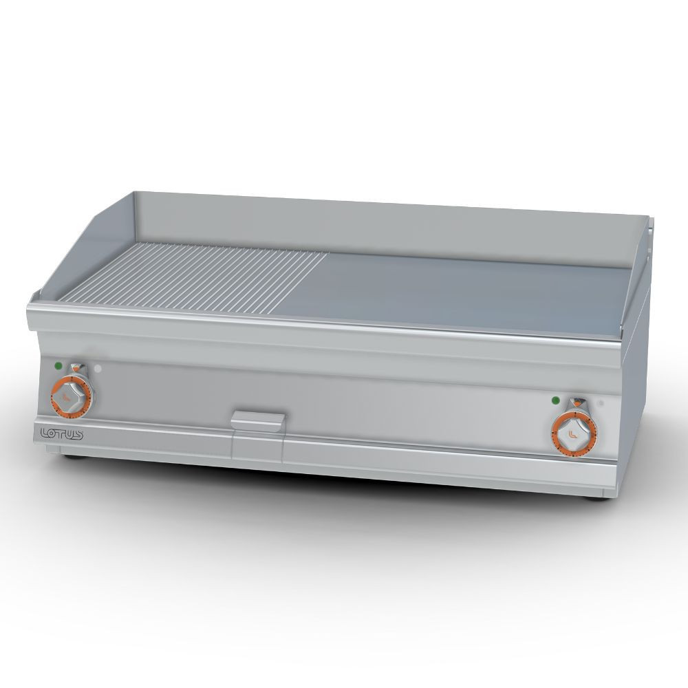 Olaszországban gyártott, nagykonyhai használatra tervezett 2 zónás, 2/5 bordázott + 3/5 sima felületű, asztali, elektromos rostlap, lapsütő, szeletsütő rozsdamentes acélból, 2,5 mm vastag munkalappal, IPX5 védelemmel.