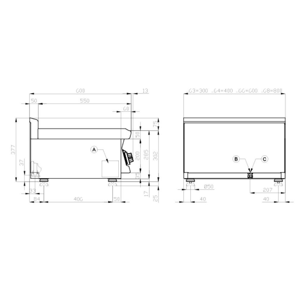 Olaszországban gyártott, nagykonyhai használatra tervezett 1 zónás, sima felületű, asztali, gázüzemű  rostlap, lapsütő, szeletsütő rozsdamentes acélból, 2,5 mm vastag munkalappal, IPX5 védelemmel.