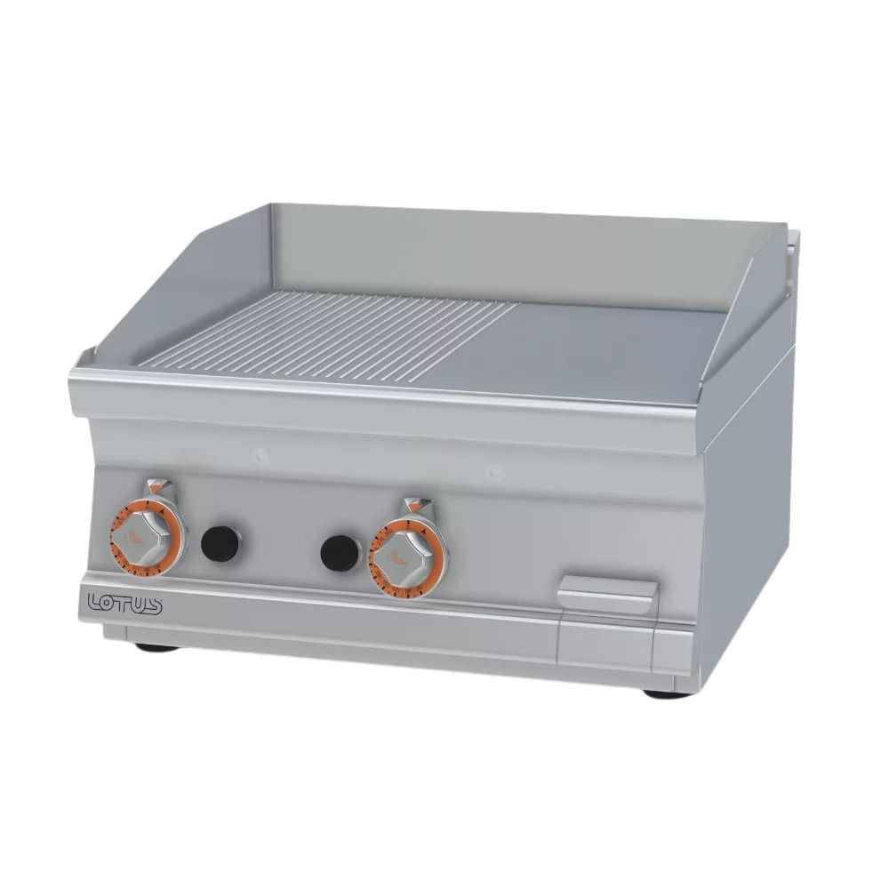 Olaszországban gyártott, nagykonyhai használatra tervezett 2 zónás, 1/2 bordázott + 1/2 sima felületű, asztali, gázüzemű rostlap, lapsütő, szeletsütő rozsdamentes acélból, 2,5 mm vastag munkalappal, IPX5 védelemmel.