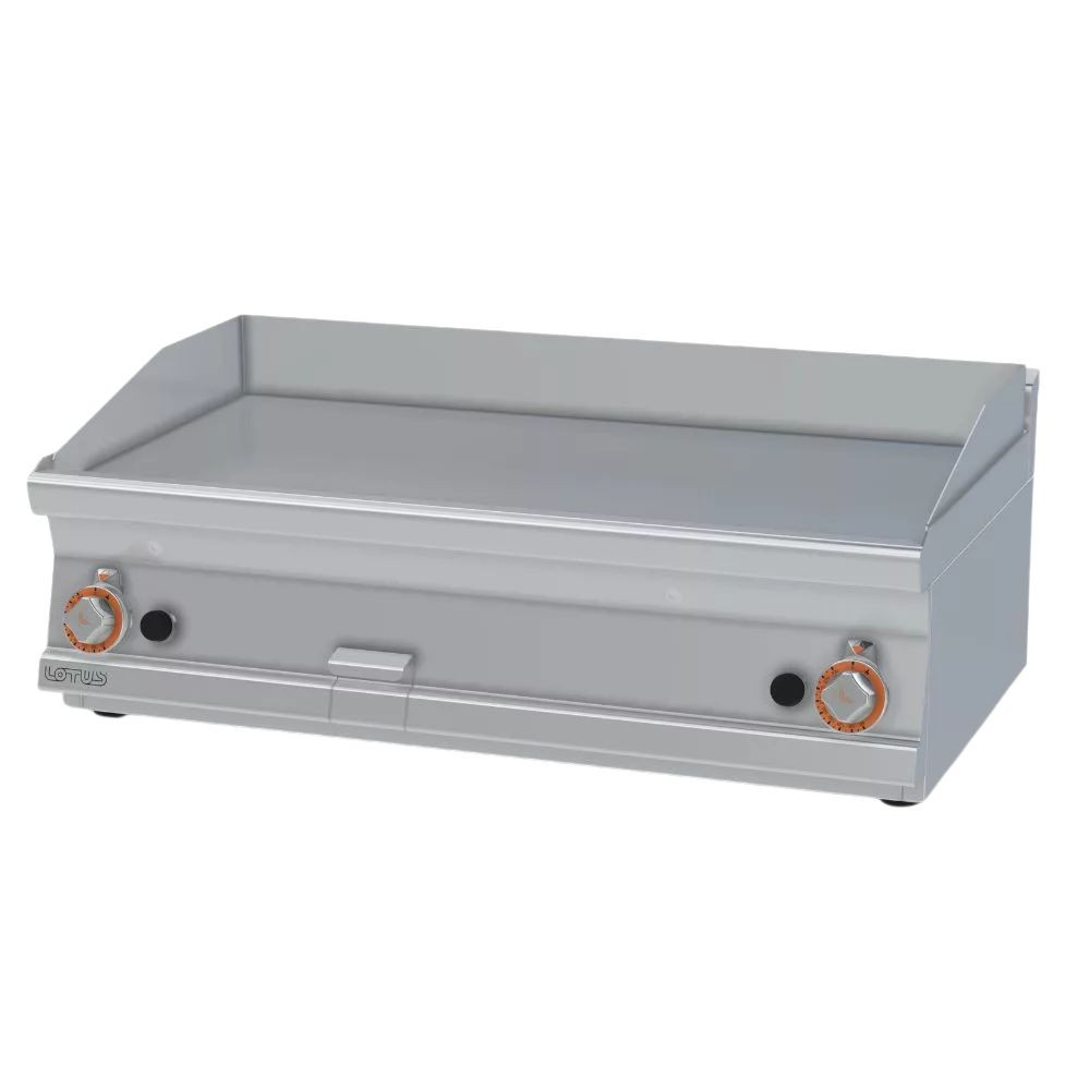 Olaszországban gyártott, nagykonyhai használatra tervezett 2 zónás, sima felületű, asztali, gázüzemű rostlap, lapsütő, szeletsütő rozsdamentes acélból, 2,5 mm vastag munkalappal, IPX5 védelemmel.