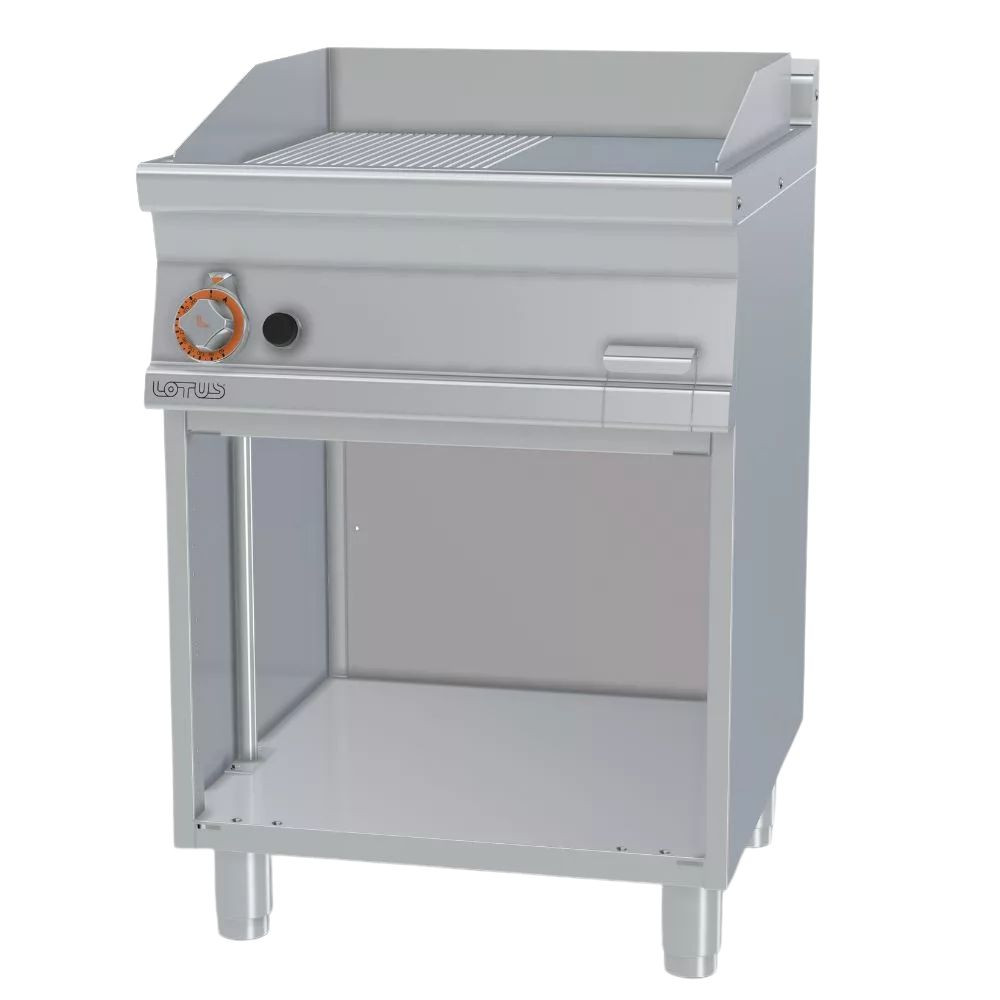 Olaszországban gyártott, nagykonyhai használatra tervezett 1 zónás, 1/2 bordázott + 1/2 sima felületű, főzősorba illeszhető, gázüzemű rostlap, lapsütő, szeletsütő rozsdamentes acélból, 2 mm vastag munkalappal, IPX5 védelemmel, nyitott alsó tárolóval.