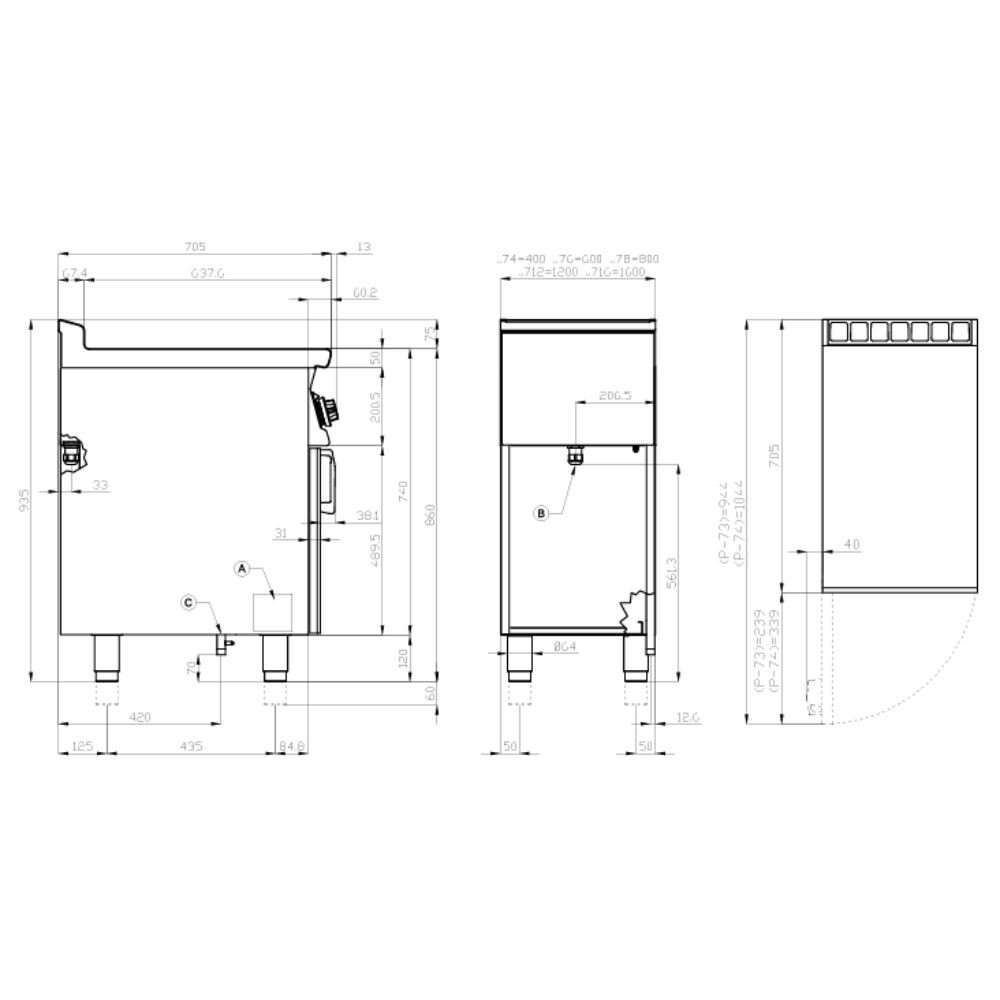 Olaszországban gyártott, nagykonyhai használatra tervezett 1 zónás, sima felületű, főzősorba illeszhető, gázüzemű rostlap, lapsütő, szeletsütő rozsdamentes acélból, 2 mm vastag munkalappal, IPX5 védelemmel, nyitott alsó tárolóval.