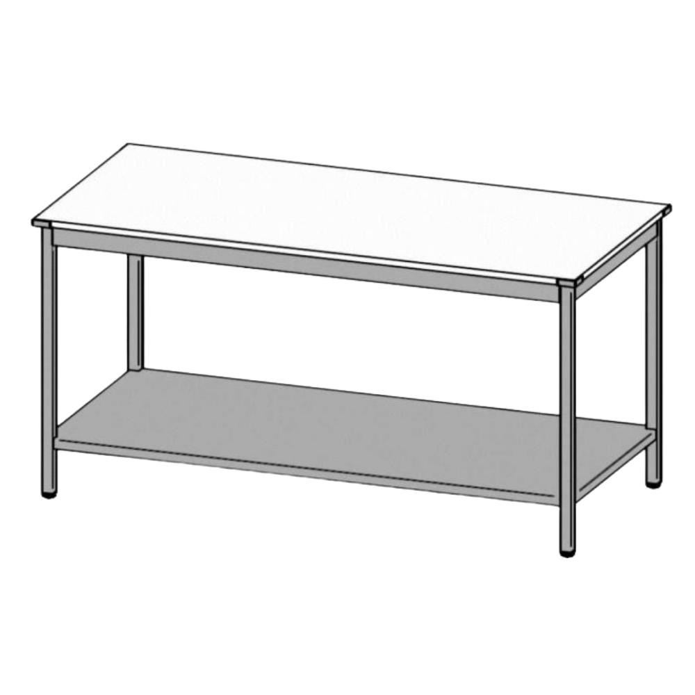 Rozsdamentes (1.4301 CrNi 18/10) munkaasztal műanyag fedlappal, alsó polccal, felhajtás nélkül. A 30 x 30 mm-es lábak szintezhetőek.
