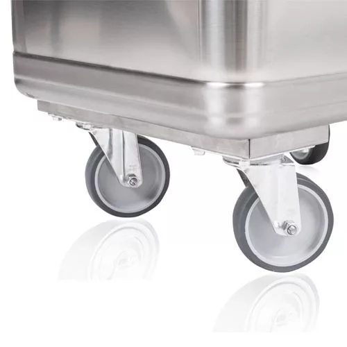 Rozsdamentes acélból készült liszteskocsi. 4 kerékkel könnyen mozgatható.