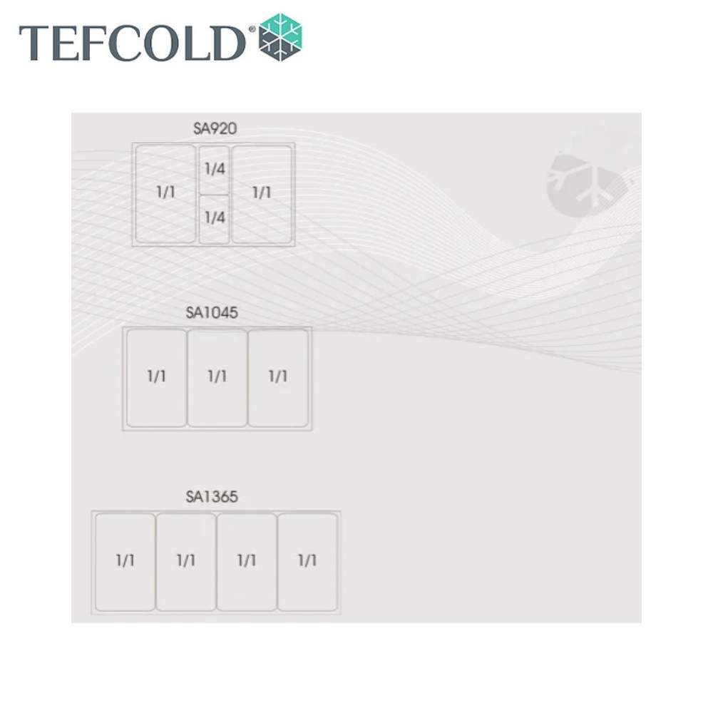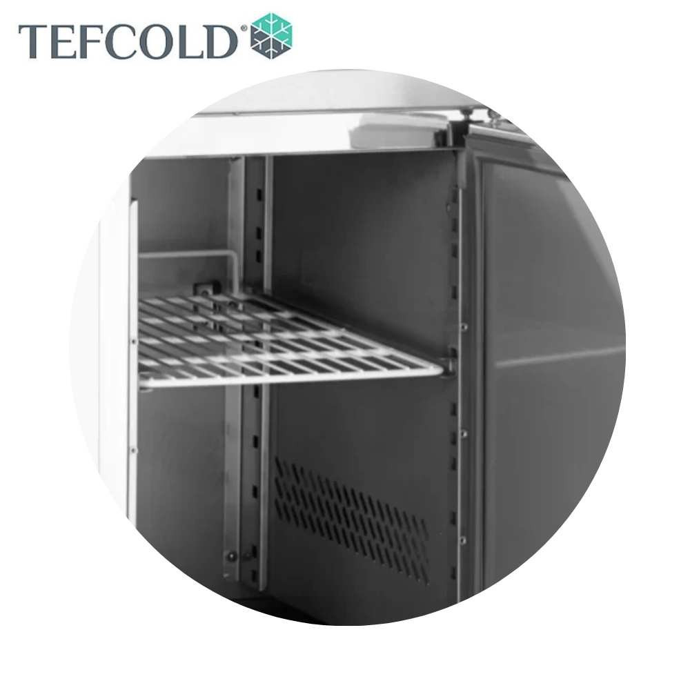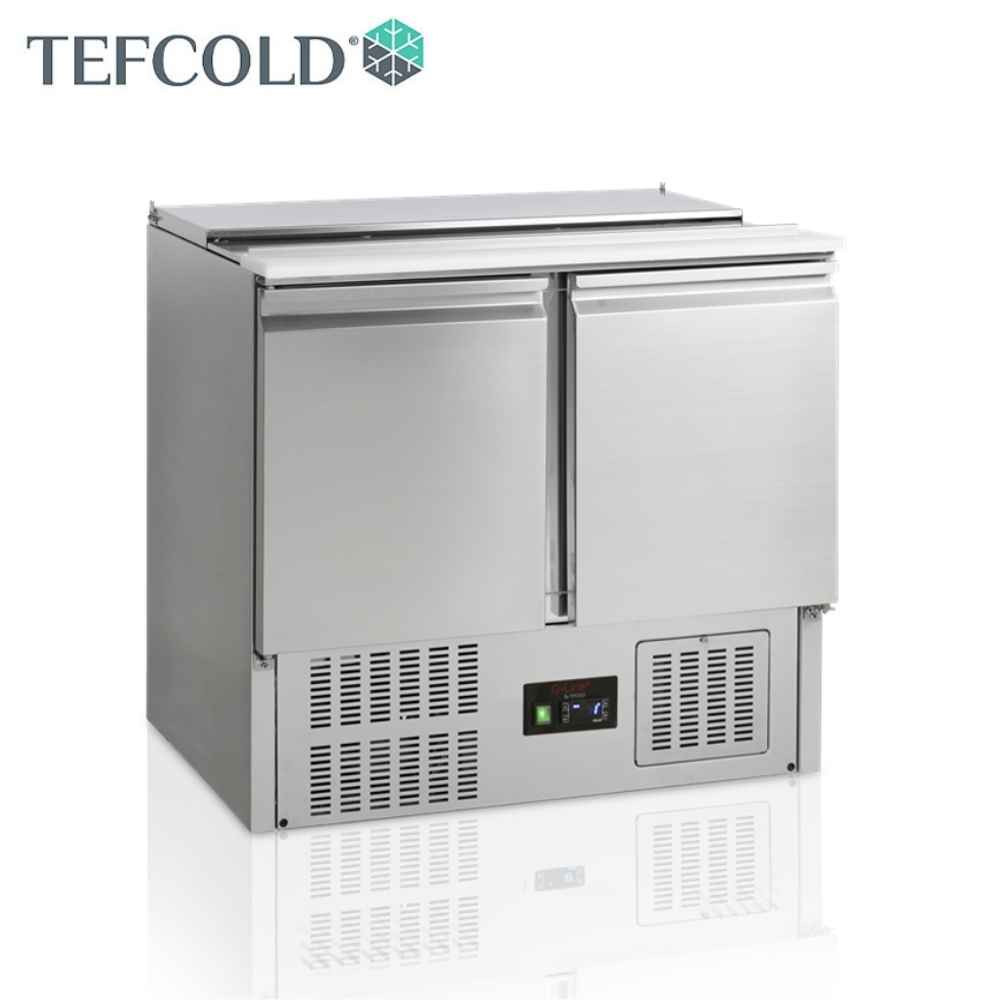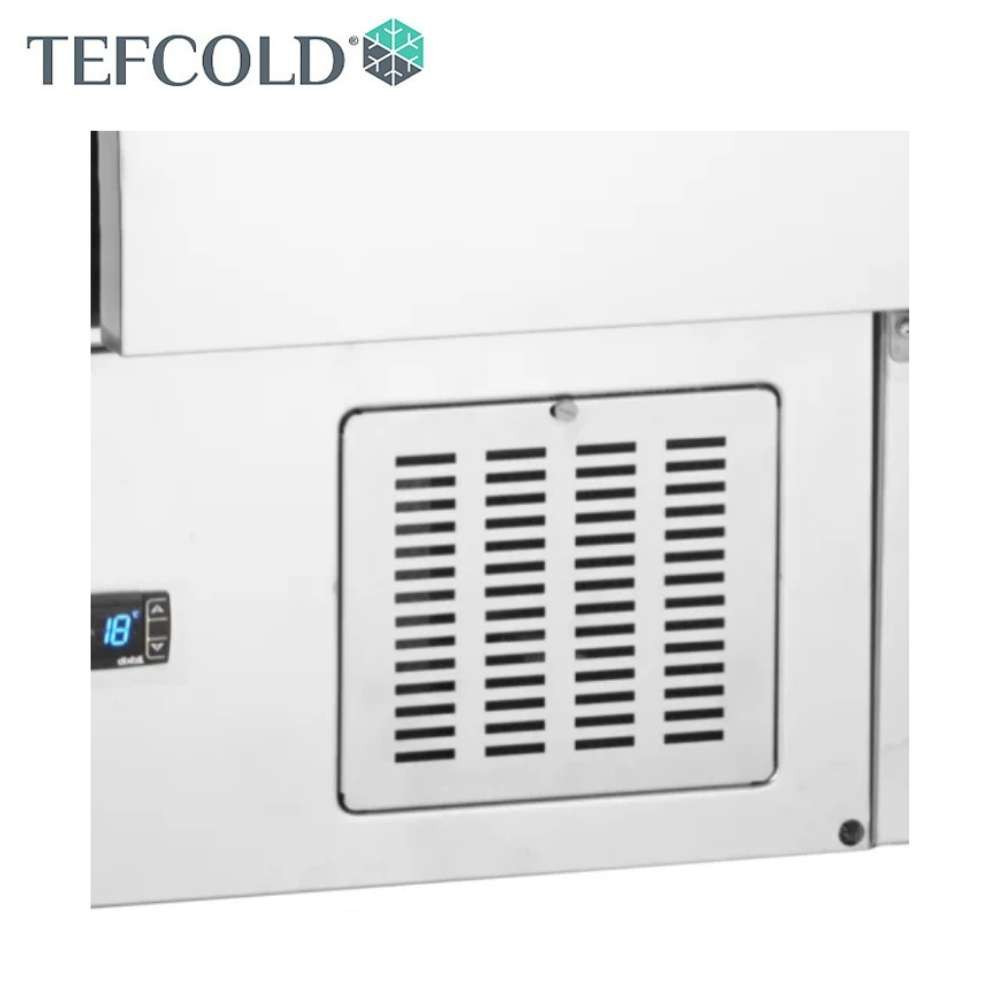 Tefcold rozsdamentes acélból készült salátahűtő pult feltéthűtő nélkül, kettő ajtóval, rozsdamentes fedlappal. Ventilációs hűtéssel, elektronikus vezérléssel és beépített hőmérővel. A leolvasztás automatikusan történik.