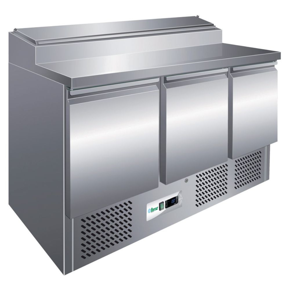 Kívül-belül rozsdamentes acélból készült salátahűtő pult beépített feltéthűtővel, 3 magától záródó ajtóval, rozsdamentes acél fedlappal.