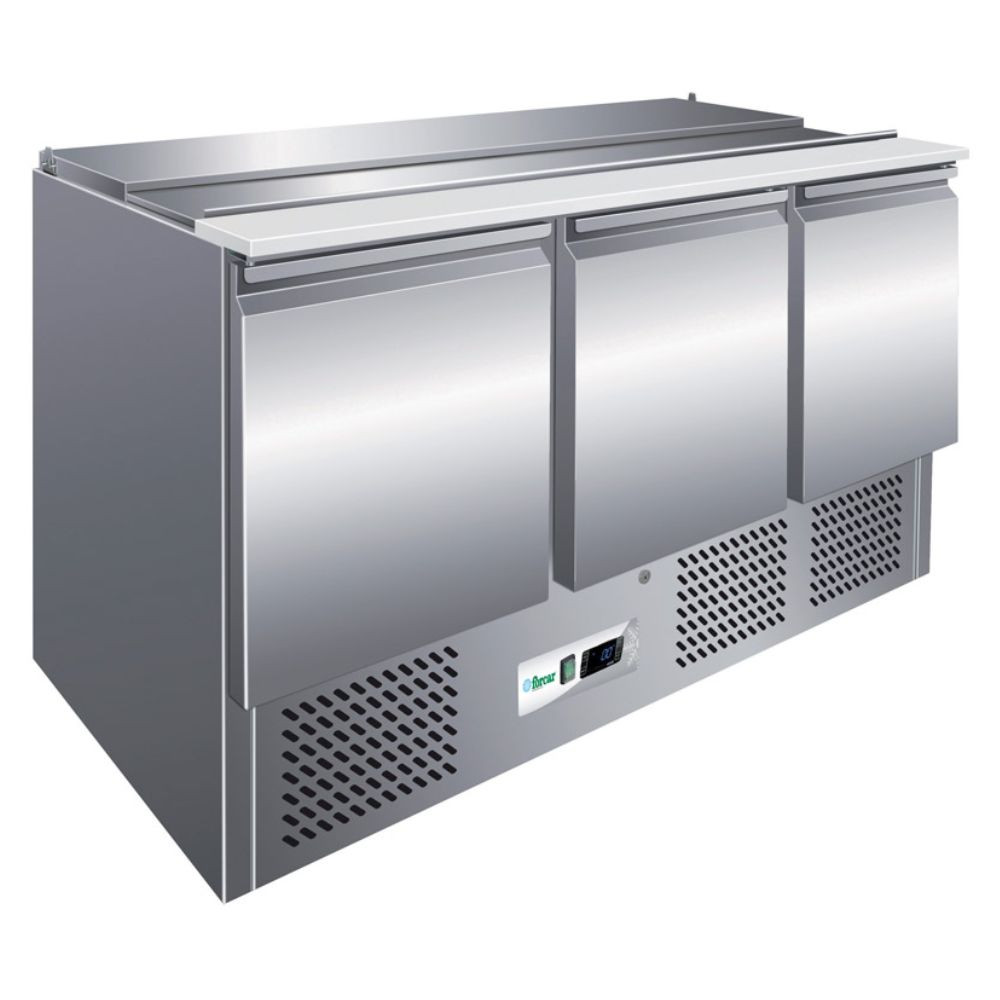 Kívül-belül rozsdamentes acélból készült salátahűtő pult feltéthűtő nélkül, 3 magától záródó ajtóval, rozsdamentes fedlappal. Statikus hűtési móddal, elektronikus vezérléssel. A kondenzvíz-párologtatás és a leolvasztás automatikusan történik.