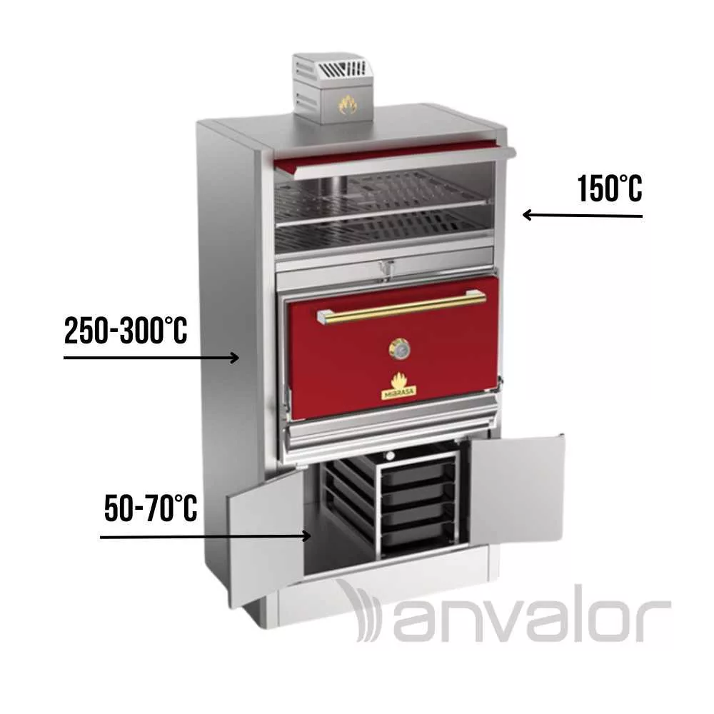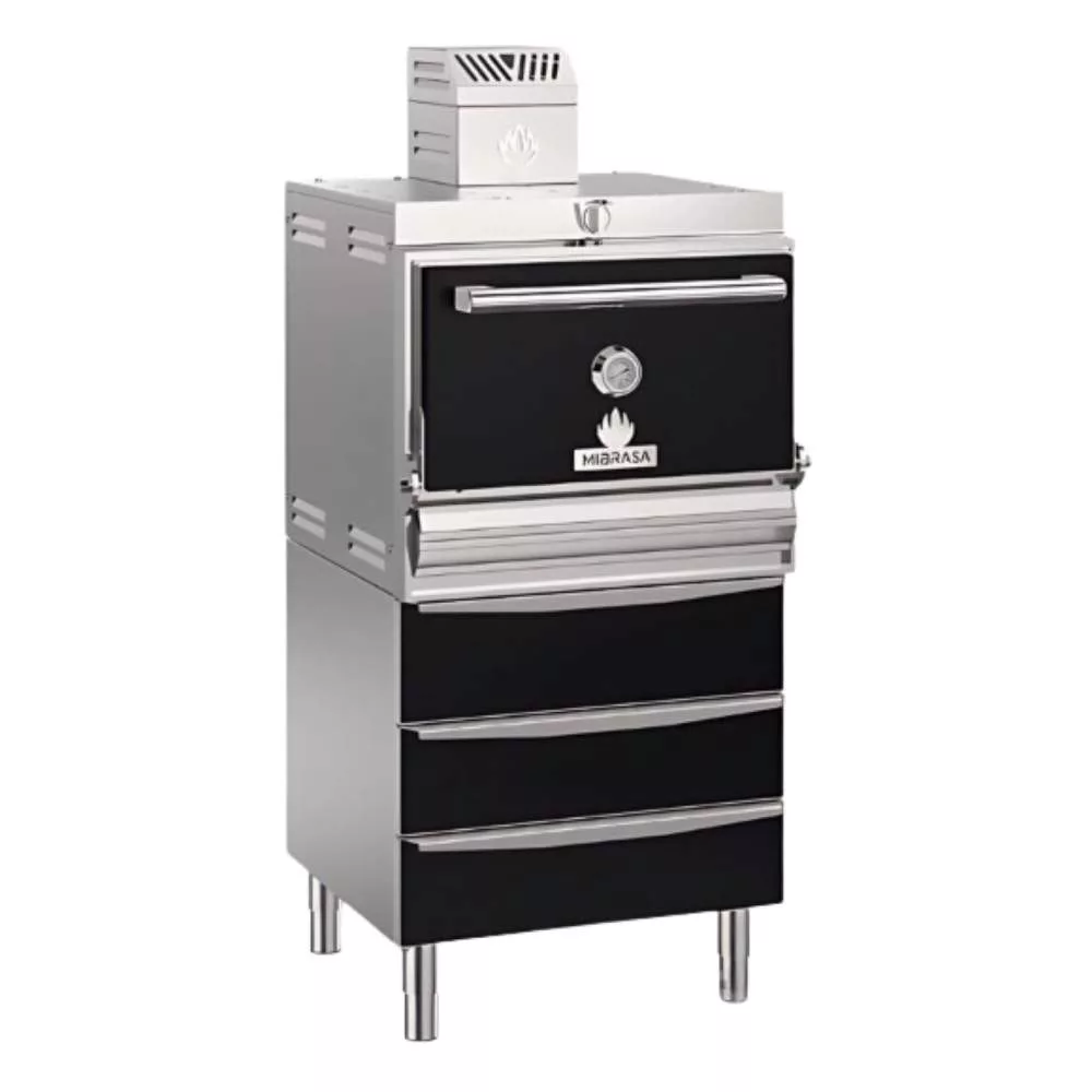 Mibrasa állványos, faszenes sütő, zárt grill. Alsó három fiókos tárolóval, légáramlás szabályzóval. Az alsó fűtött fiókok hőmérséklete egyre alacsonyabb, így egyszerre akár konfitálhatunk, párolhatunk, dehidratálhatunk. Az alsó fiókok hőmérséklete: 90ºC - 65ºC - 55ºC. A felső melegentartó rács hőmérséklete 40-60°C között van, optimalizálva a sütő maradékhőjét. Több színben elérhető, így minden konyhához megtalálható a tökéletes stílus.