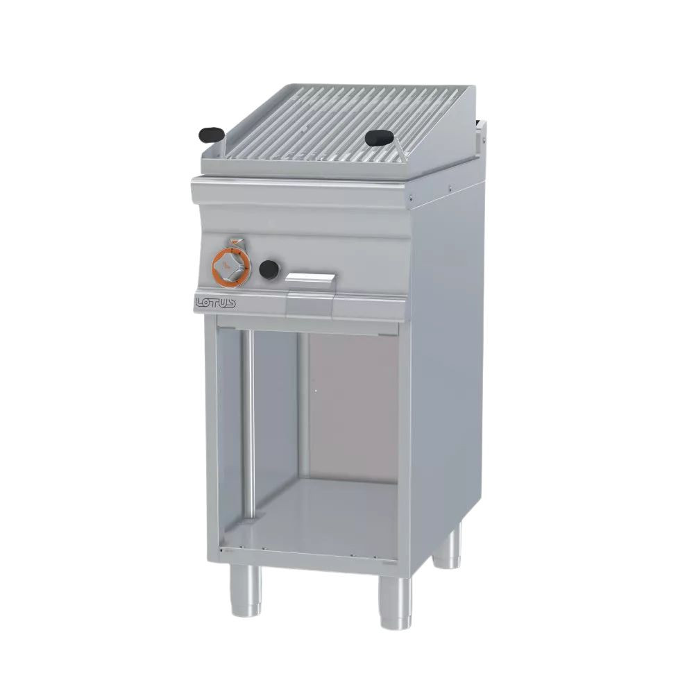 Olaszországban gyártott, rozsdamentes acél, nyílt rostélyú, gázüzemű rostlap, nyitott tárolóval, 2 mm vastag munkalappal, IPX5 védelemmel. A készüléket állítható lábakkal szállítjuk.