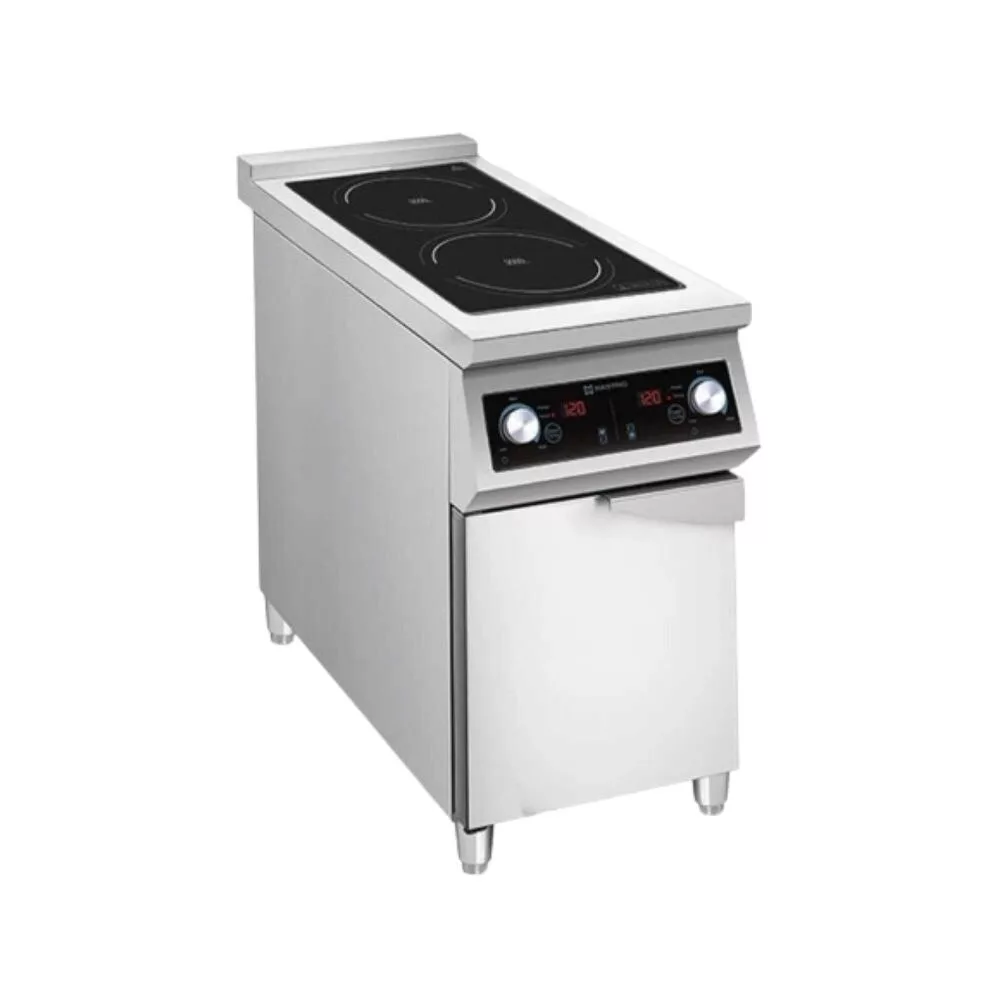 Indukciós tűzhely 2 db 5,0 kW-os főzőzónával, zárt szekrényen, rozsdamentes acélból.