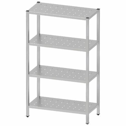 Rozsdamentes acélból készült konyhai tároló állvány, 4 db perforált polccal. A polcok közötti távolság 480 mm, a polcok vastagsága 50 mm. A polclapok rezgésmentesek, rozsdamentes merevítőbordákkal erősítettek.