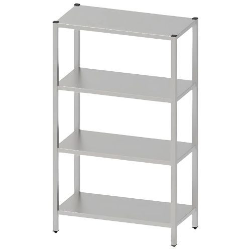 Rozsdamentes acélból (CrNi 18/10) készült konyhai tároló állvány, 4 db sima polccal, 30x30-as zártszelvény lábakkal, műanyag szintezhető talpakkal, 30mm-es fedlapvastagsággal. A polcok fixen hegesztettek.