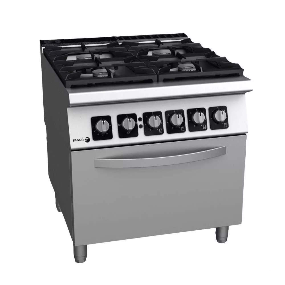 Spanyolországban gyártott, rozsdamentes acél kivitelű, gázüzemű asztali ipari tűzhely, 4 rózsás. Öntöttvas edénytartó ráccsal és őrlánggal. Összteljesítmény: 34,7 kW.