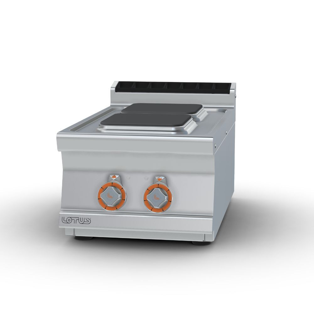 Olaszországban gyártott, rozsdamentes acél kivitelű, elektromos, asztali ipari tűzhely, főzőlap, 2 zónával, 2 mm vastag munkalappal, IPX5 védelemmel. A szögletes főzőfelületek öntöttvasból készültek, a tekerőgomb 7 pozícióval rendelkezik.