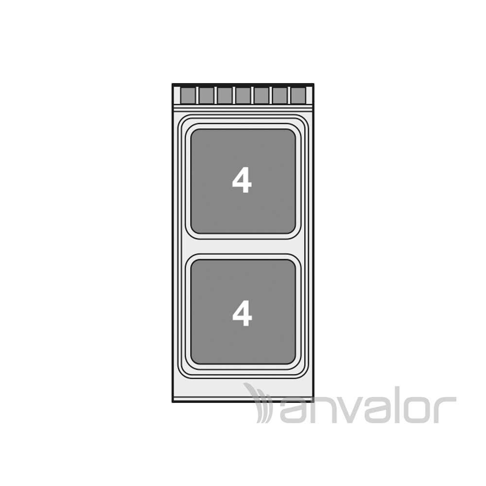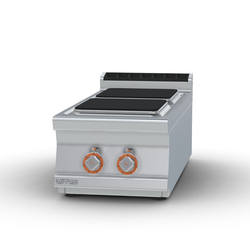 Olaszországban gyártott, rozsdamentes acél kivitelű, elektromos, asztali ipari tűzhely, főzőlap, 2 zónával, 2 mm vastag munkalappal, IPX5 védelemmel. A szögletes főzőfelületek öntöttvasból készültek, a tekerőgomb 7 pozícióval rendelkezik.