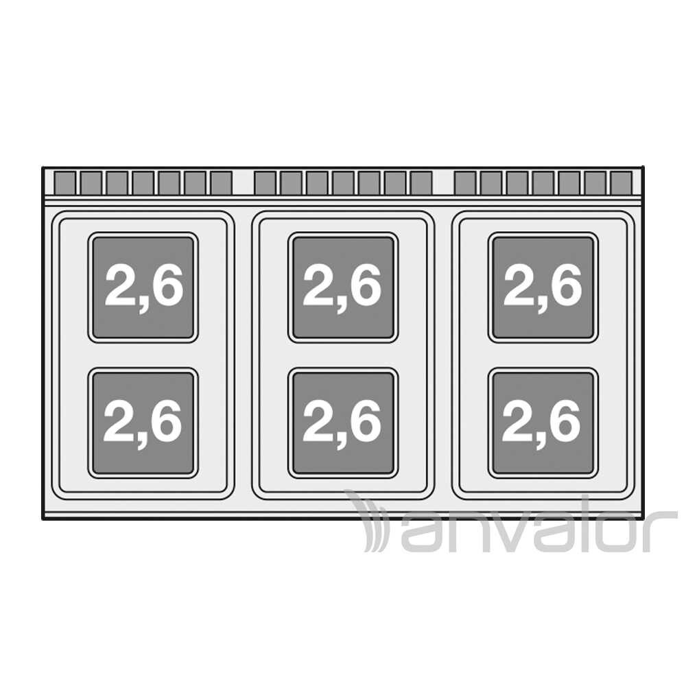 Olaszországban gyártott, rozsdamentes acél kivitelű, elektromos, asztali ipari tűzhely, főzőlap, 6 zónával, 2 mm vastag munkalappal, IPX5 védelemmel. A szögletes főzőfelületek öntöttvasból készültek, a tekerőgomb 7 pozícióval rendelkezik.