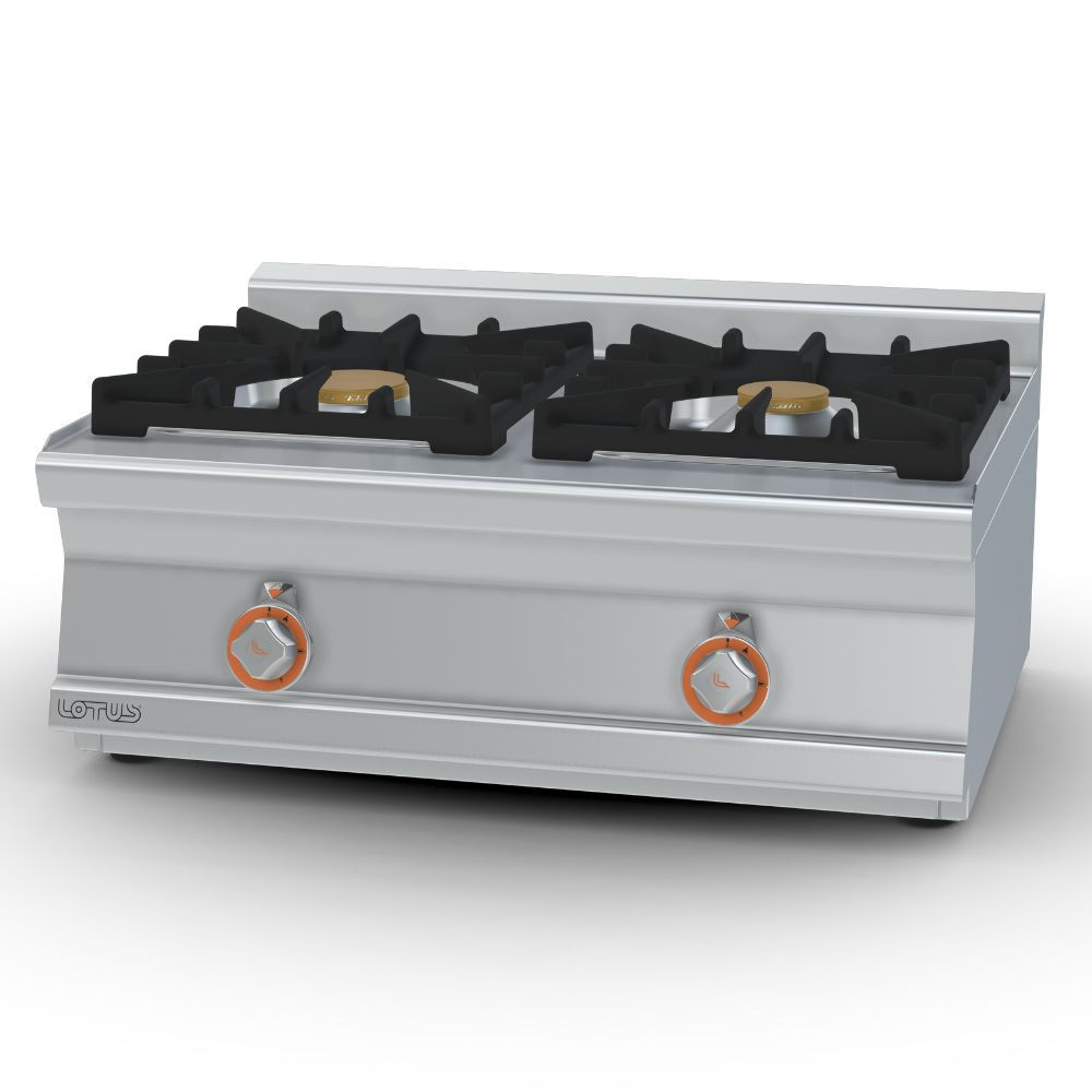 Olaszországban gyártott, rozsdamentes acél kivitelű, gázüzemű, asztali, ipari tűzhely, főzőlap, 2 égőfejjel, 1 mm vastag munkalappal, IPX5 védelemmel.