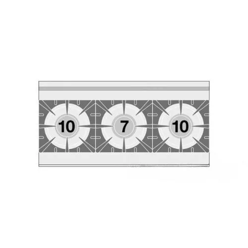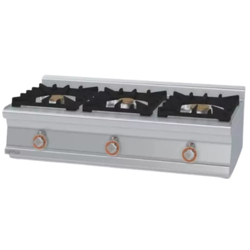 Olaszországban gyártott, rozsdamentes acél kivitelű, gázüzemű, asztali, ipari tűzhely, főzőlap, 3 égőfejjel, 1 mm vastag munkalappal, IPX5 védelemmel.