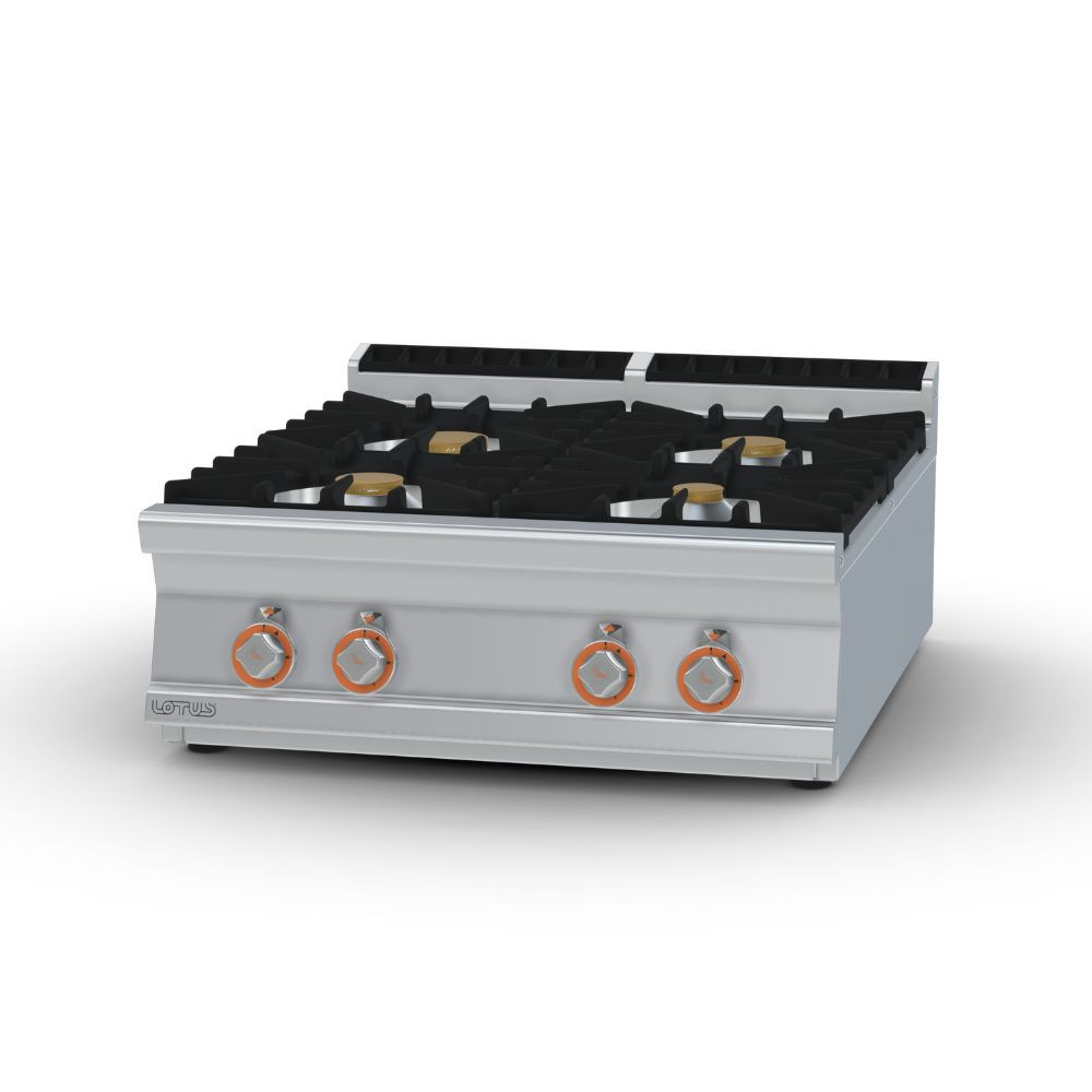 Olaszországban gyártott, rozsdamentes acél kivitelű, gázüzemű, asztali, ipari tűzhely, főzőlap, 4 égőfejjel, 2 mm vastag munkalappal, IPX5 védelemmel.