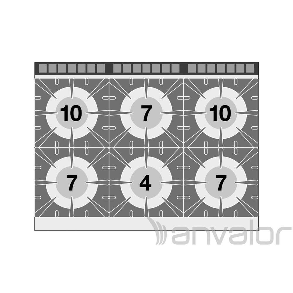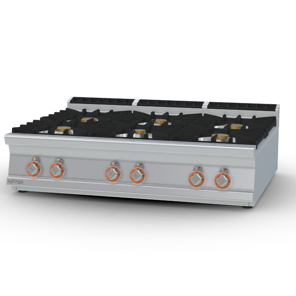 Olaszországban gyártott, rozsdamentes acél kivitelű, gázüzemű, asztali, ipari tűzhely, főzőlap, 6 égőfejjel, 2 mm vastag munkalappal, IPX5 védelemmel.