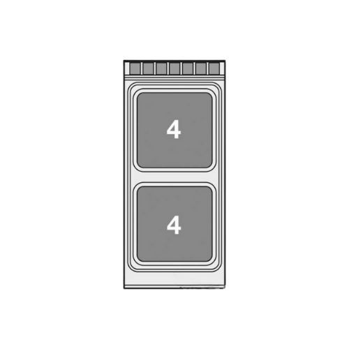 Olaszországban gyártott, rozsdamentes acél kivitelű, elektromos, ipari tűzhely, főzőlap, 2 zónával, 2 mm vastag munkalappal, nyitott alsó tárolóval, IPX5 védelemmel. A szögletes főzőfelületek öntöttvasból készültek, a tekerőgomb 7 pozícióval rendelkezik.