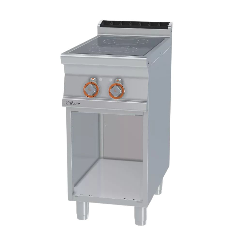 Olaszországban gyártott, rozsdamentes acél kivitelű, elektromos ipari tűzhely, főzőlap, 2 zónával, 2 mm vastag munkalappal, nyitott alsó tárolóval, IPX5 védelemmel. A főzőfelületek üvegkerámiából készültek, a tekerőgomb 7 pozícióval rendelkezik.