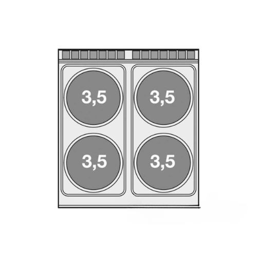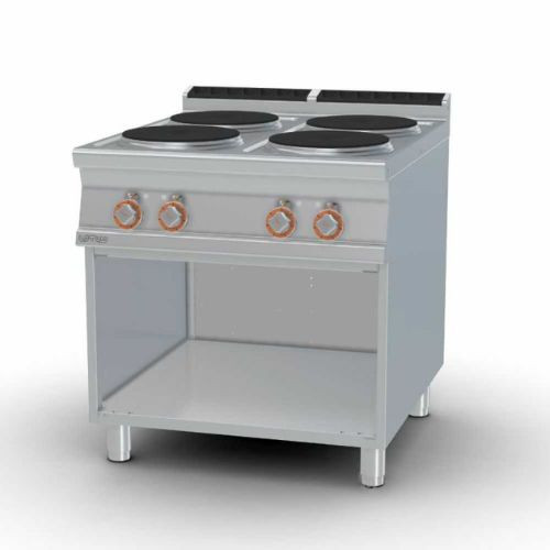 Olaszországban gyártott, rozsdamentes acél kivitelű, elektromos, ipari tűzhely, főzőlap, 4 zónával, 2 mm vastag munkalappal, nyitott alsó tárolóval, IPX5 védelemmel. A körlapos főzőfelületek öntöttvasból készültek, a tekerőgomb 7 pozícióval rendelkezik.
