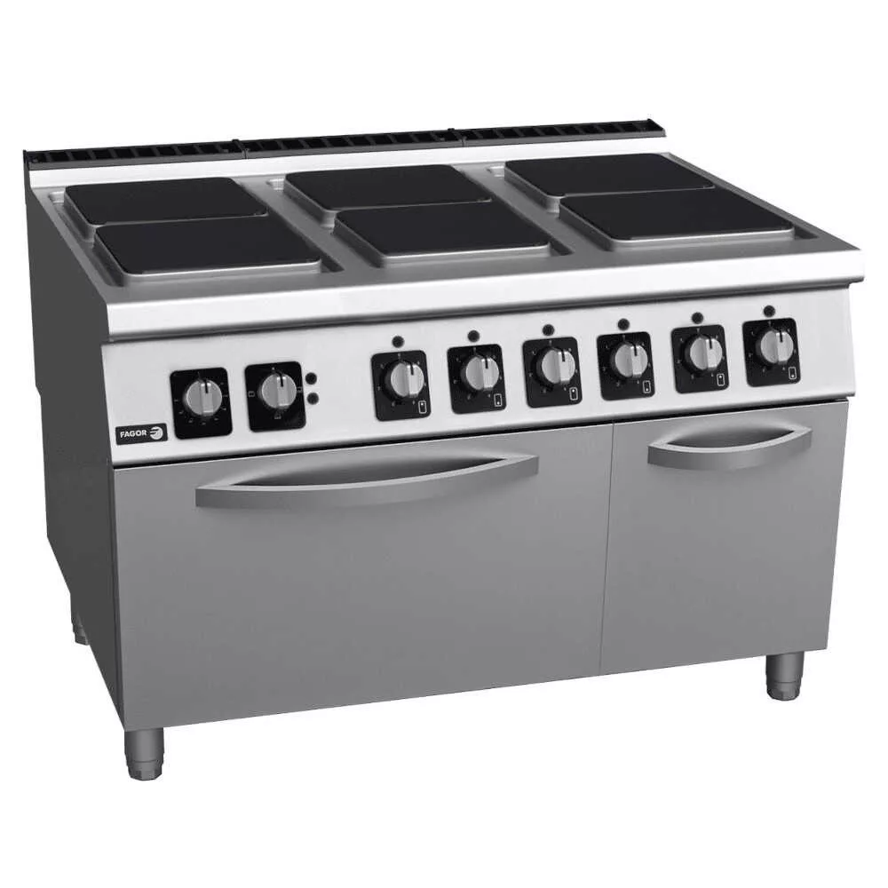 Spanyolországban gyártott, rozsdamentes acél kivitelű, elektromos ipari tűzhely, 6 zónás. Összteljesítmény: 30 kW.