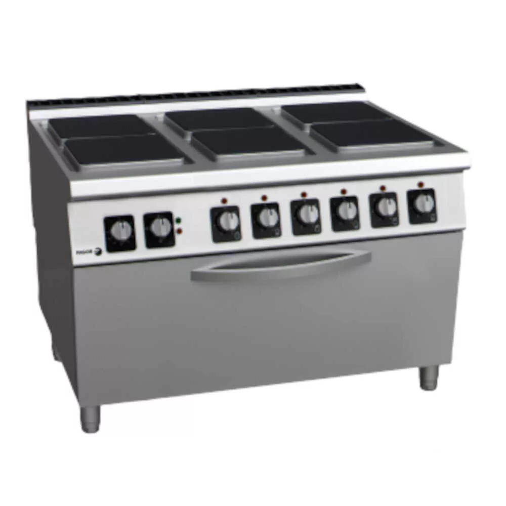 Spanyolországban gyártott, rozsdamentes acél kivitelű, elektromos ipari tűzhely, 6 zónás. Összteljesítmény: 36 kW.