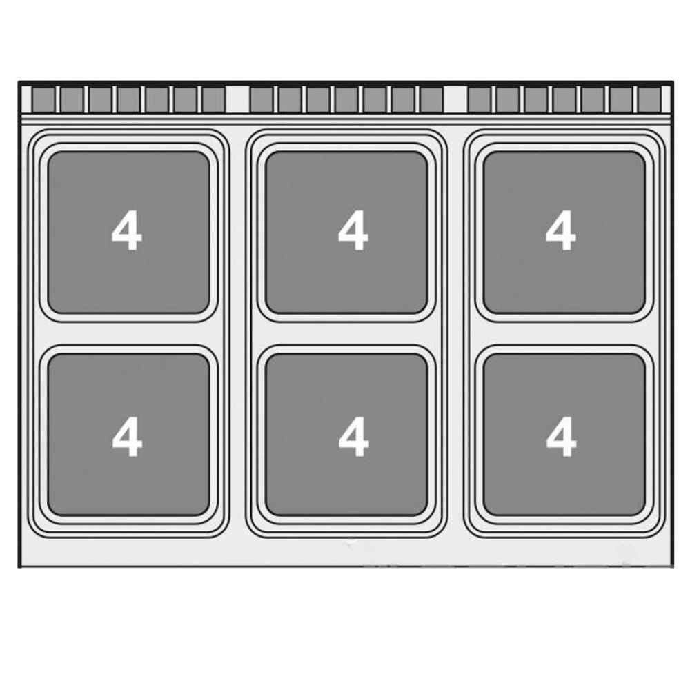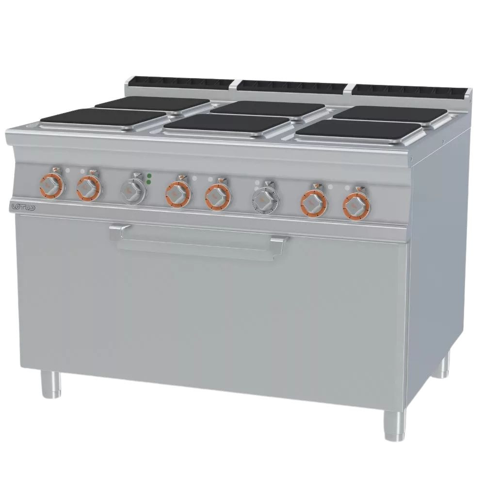 Olaszországban gyártott, rozsdamentes acél kivitelű elektromos ipari tűzhely, 6 zónával, 2 mm vastag munkalappal, elektromos statikus sütővel, tárolóval, IPX5 védelemmel. A szögletes főzőfelületek öntöttvasból készültek, a tekerőgomb 7 pozícióval rendelkezik. Sütőrács mérete: GN2/1.