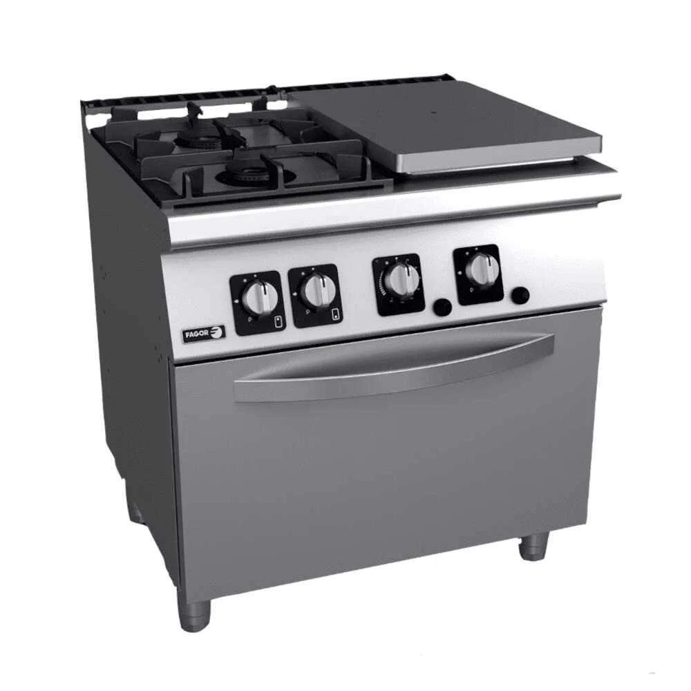 Nagyteljesítményű gázüzemű ipari tűzhely, rozsdamentes acél kivitelben, 2 zónával és jobb oldalon elhelyezett francia lappal és statikus GN 2/1 méretű sütővel. Összteljesítmény: 27,1 kW.