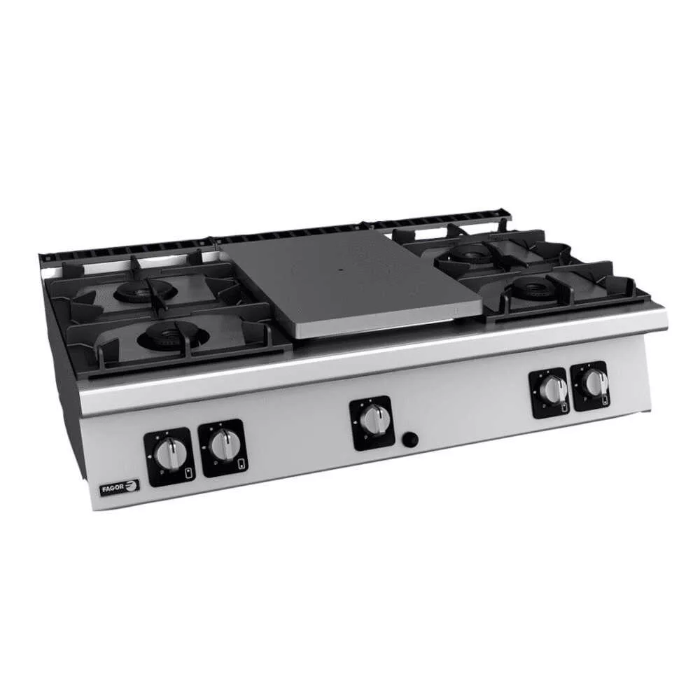 Spanyolországban gyártott, rozsdamentes acél kivitelű, gázüzemű asztali ipari tűzhely, 4 rózsás. Öntöttvas edénytartó ráccsal és őrlánggal. Összteljesítmény: 31,75 kW.