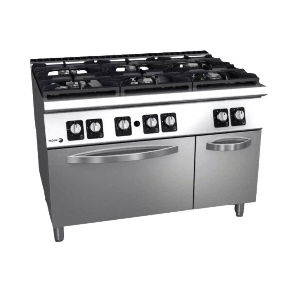 Spanyolországban gyártott, rozsdamentes acél kivitelű, gázüzemű asztali ipari tűzhely, 6 rózsás. Öntöttvas edénytartó ráccsal és őrlánggal. Összteljesítmény: 50,55 kW.