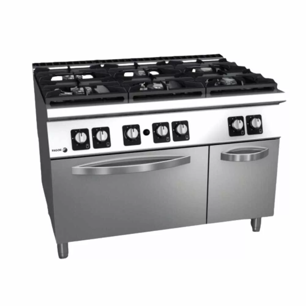 Spanyolországban gyártott, rozsdamentes acél kivitelű, gázüzemű asztali ipari tűzhely, 6 rózsás. Öntöttvas edénytartó ráccsal és őrlánggal. Összteljesítmény: 58,8 kW.
