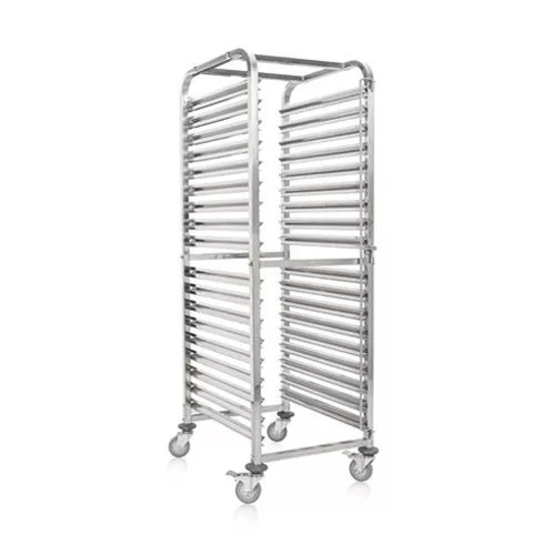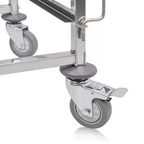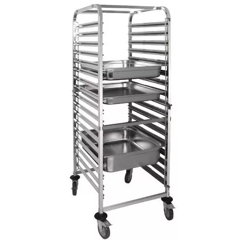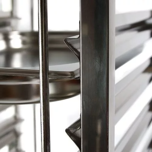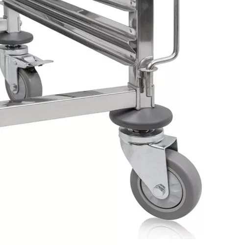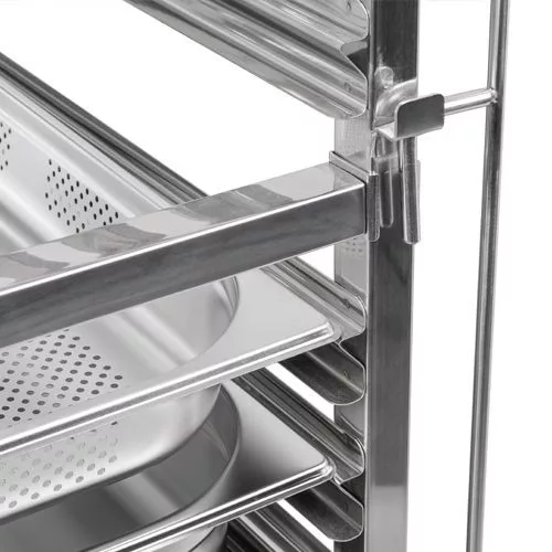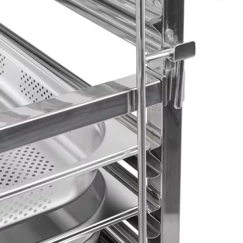 Rozsdamentes acélból készült regál, tálcaszedő kocsi, 18 db GN 2/1 tálca férőhellyel, 70 mm-es sinbeosztással.
