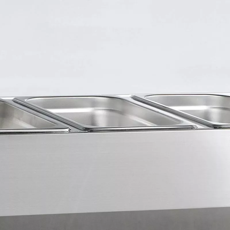 Professzionális GN1/4 edényekhez kialakított feltéthűtő, statikus hűtéssel és üveg leheletvédővel. Ideális pizzériákba, gyorséttermekbe és szendvicsbárokba, ahol fontos a gyors és higiénikus előkészítés. Tartós SS201 rozsdamentes acél kivitel, manuális leolvasztás, megbízható működés. A hozzávalók mindig kézközelben, optimális hőmérsékleten tarthatók.