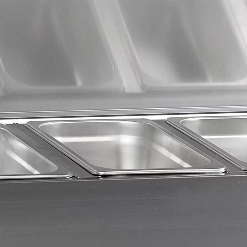 Professzionális GN1/4 edényekhez kialakított feltéthűtő, statikus hűtéssel, rozsdamentes acél fedéllel. Ideális pizzériákba, gyorséttermekbe és szendvicsbárokba, ahol fontos a gyors és higiénikus előkészítés. Tartós SS201 rozsdamentes acél kivitel, manuális leolvasztás, megbízható működés. A hozzávalók mindig kézközelben, optimális hőmérsékleten tarthatók.