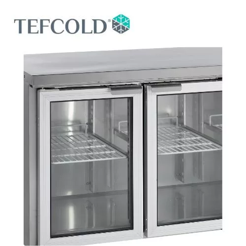 4 üveg ajtós hűtött munkaasztal, kívül-belül rozsdamentes acél kivitelben, ventilációs hűtéssel, automatikus leolvasztással. A felső munkalap eltávolítható, így a hűtő pult alá is beépíthető, és akár saját munkalappal is kiegészíthető.
