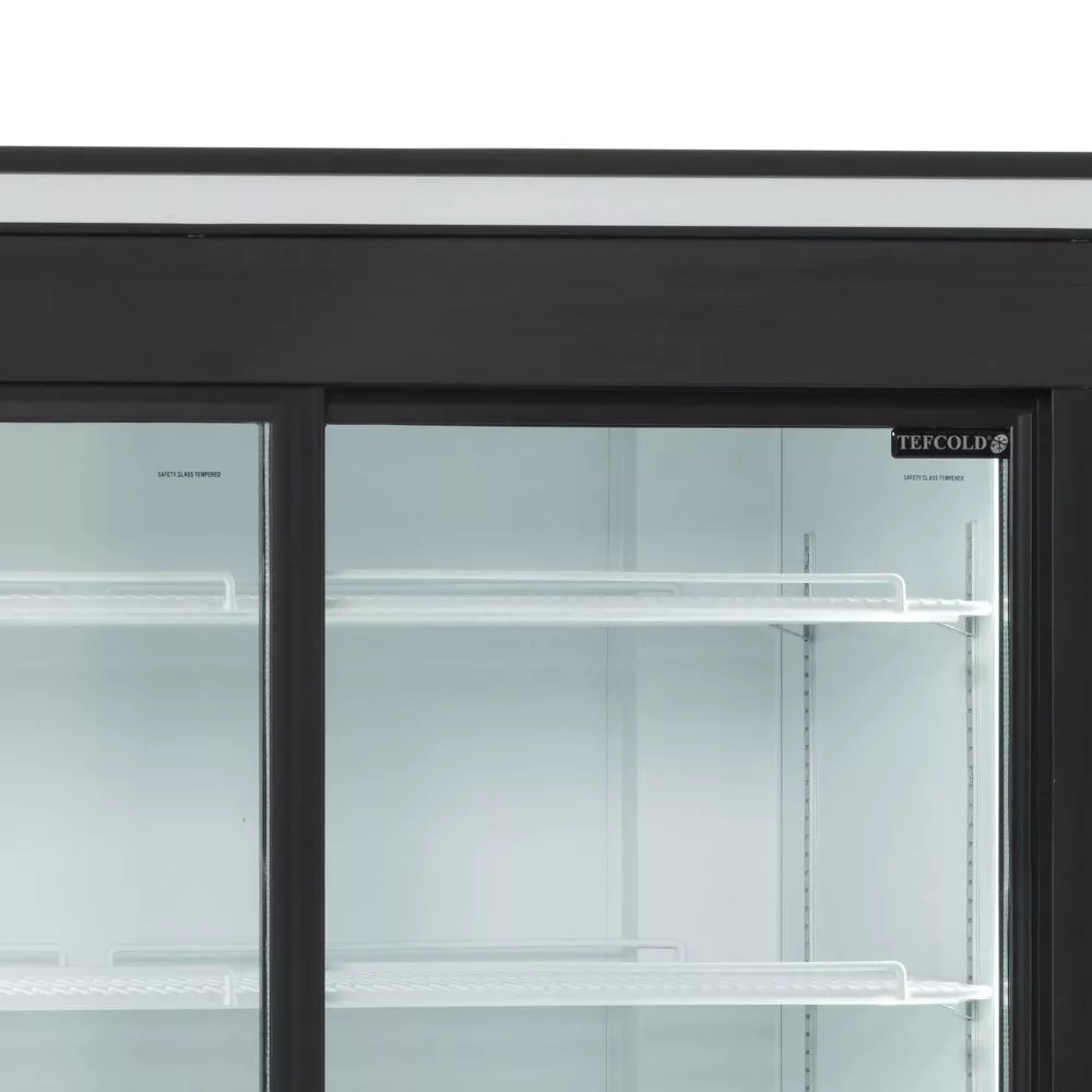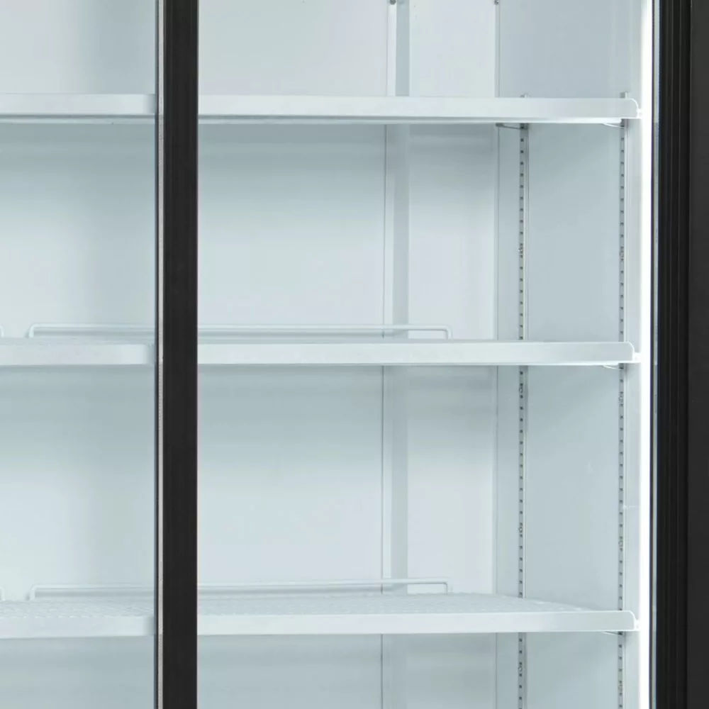 2 ajtós hűtővitrin, fehér külsővel és belsővel, világító hírdető panellel, függőleges belső világítással, állítható polcokkal, állítható lábakkal, önzáró üveg tolóajtókkal, ventilációs hűtéssel. Csábító kidolgozás, a tartalmat tökéletesen megvilágító, az ajtókereten belüli 2 db függőleges teljes hosszúságú LED lámpával. Ideális csúcskategóriás kávézókhoz, csemegeüzletekhez és cukrászdákhoz.