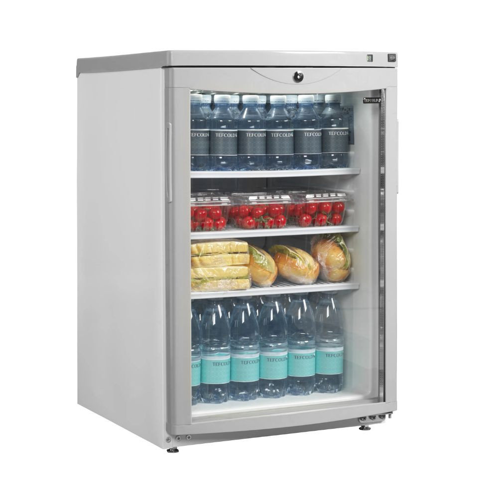 Professzionális hűtővitrin fehér színben, megfordítható görbített üvegajtóval, 92 literes űrtartalommal (Nettó: 85 liter) állítható polcokkal, palásthűtéssel, zárral.