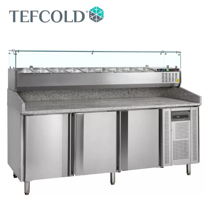 Hűtött pizza munkaasztal, rozsdamentes acélból, gránit asztallappal, 3 db önzáródó ajtó, ajtónként 7 db 400 x 600 mm-es pizzatálca számára. A feltéthűtőbe 9 db GN1/3-as méretű edény illeszkedik.