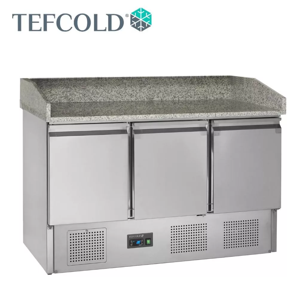 Hűtött pizza munkaasztal, rozsdamentes acélból, gránit asztallappal, 3 db GN1/1-es méretű ajtós tárolóval.