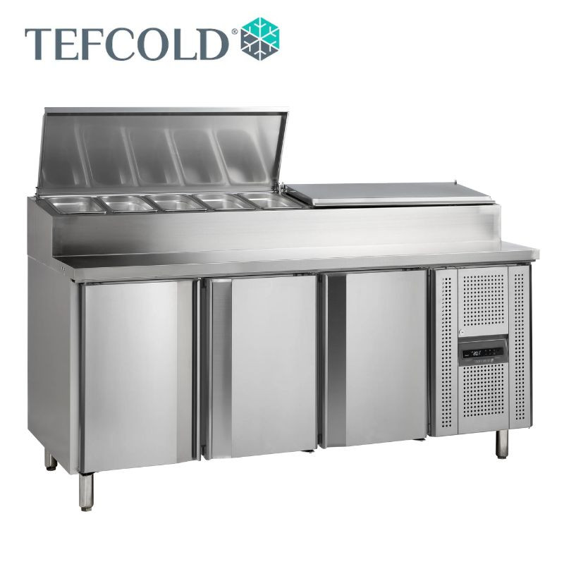Salátahűtő pult GN1/1 három ajtóval — professzionális pultfeltét és rozsdamentes munkalap