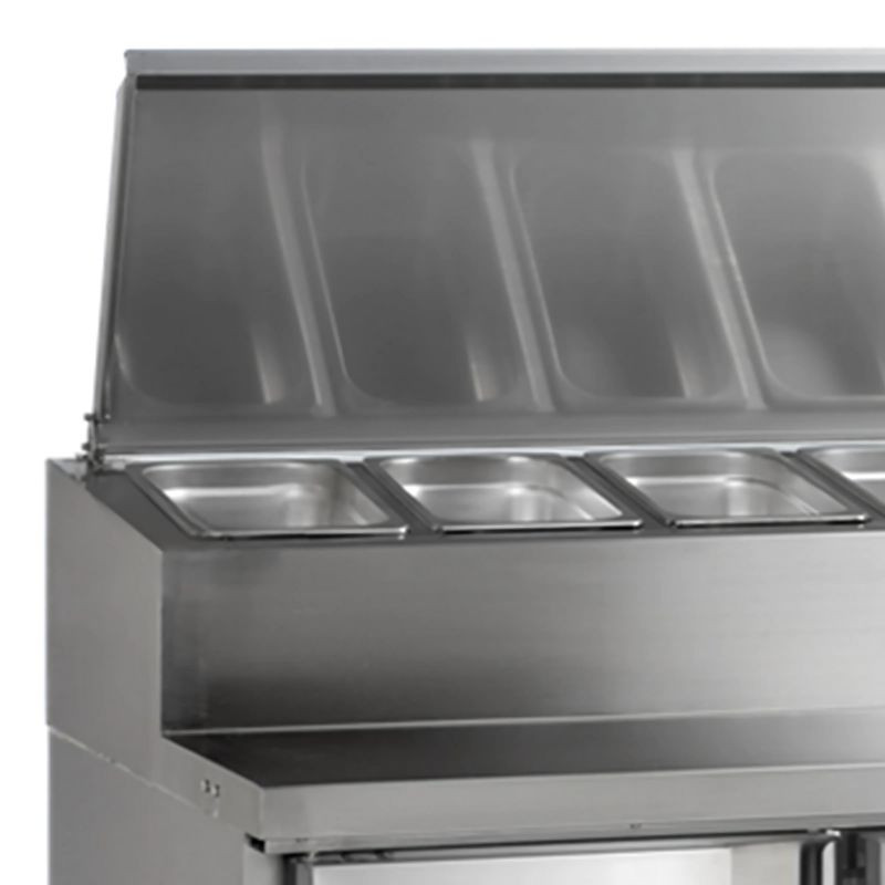 A jobb oldali hűtőegység kialakítása praktikus elrendezést tesz lehetővé a munkafolyamatokban: a szerelvény jobb oldalára telepített kompresszor egyszerűsíti a telepítést olyan konyhákban, ahol a csatlakozások és a munkafolyamatok oldalfelosztása meghatározott. A rozsdamentes munkalap tartós, könnyen tisztítható és megfelel a szigorú élelmiszer-higiéniai követelményeknek, így ideális előkészítési felületként és tálalósávként is.