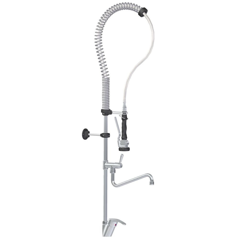 Asztali zuhany karos csapteleppel, nagy markolatú, kiakasztható zuhanyfejjel, erősített tömlővel. Alsó vízvételi lehetőség külön kifolyón. A nyitókar állandó áteresztése kirögzíthető.
