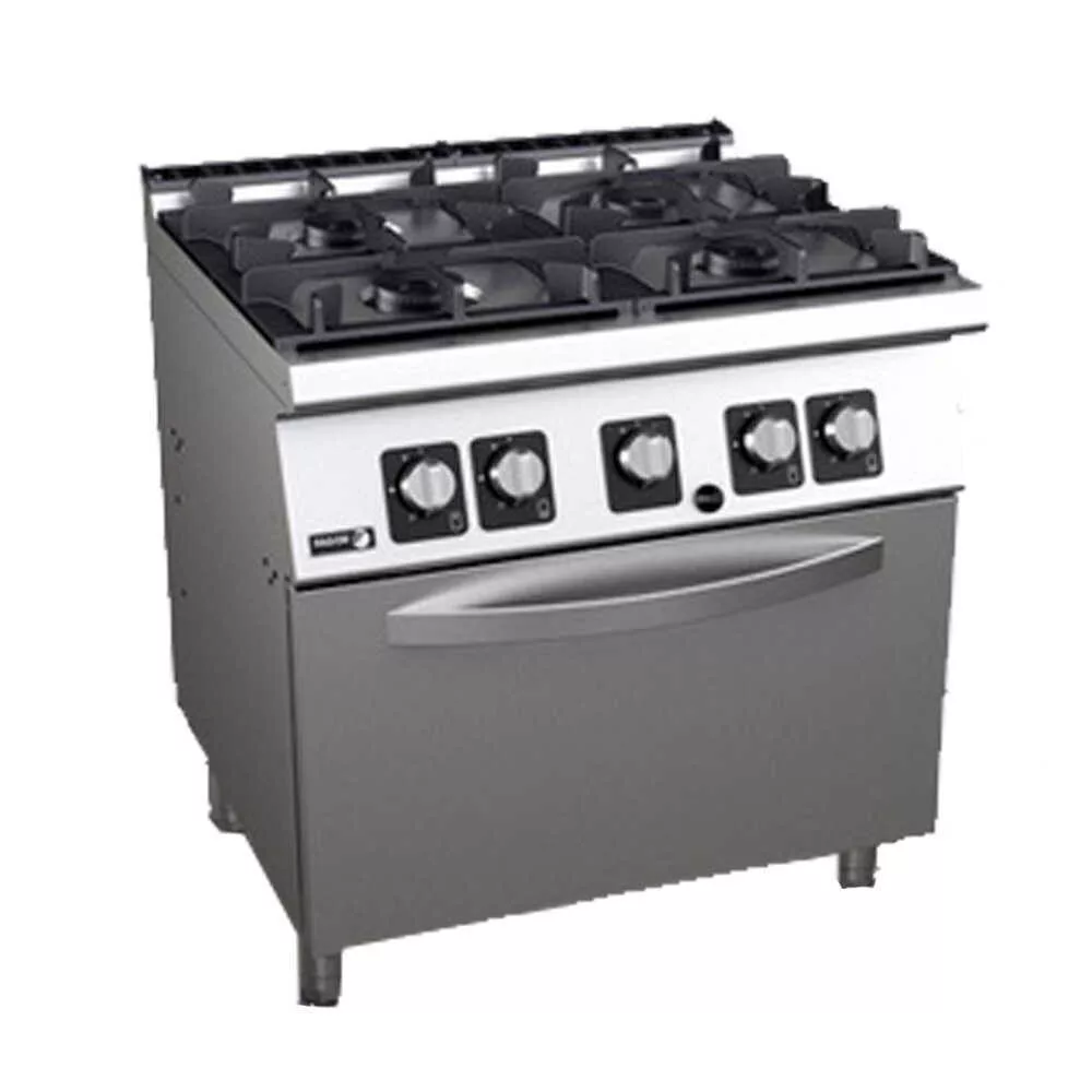 Spanyolországban gyártott, rozsdamentes acél kivitelű, gázüzemű ipari tűzhely, 4 rózsás. Öntöttvas edénytartó ráccsal és őrlánggal, GN2/1-es stattikus elektromos sütővel.. Összteljesítmény: 38 kW.