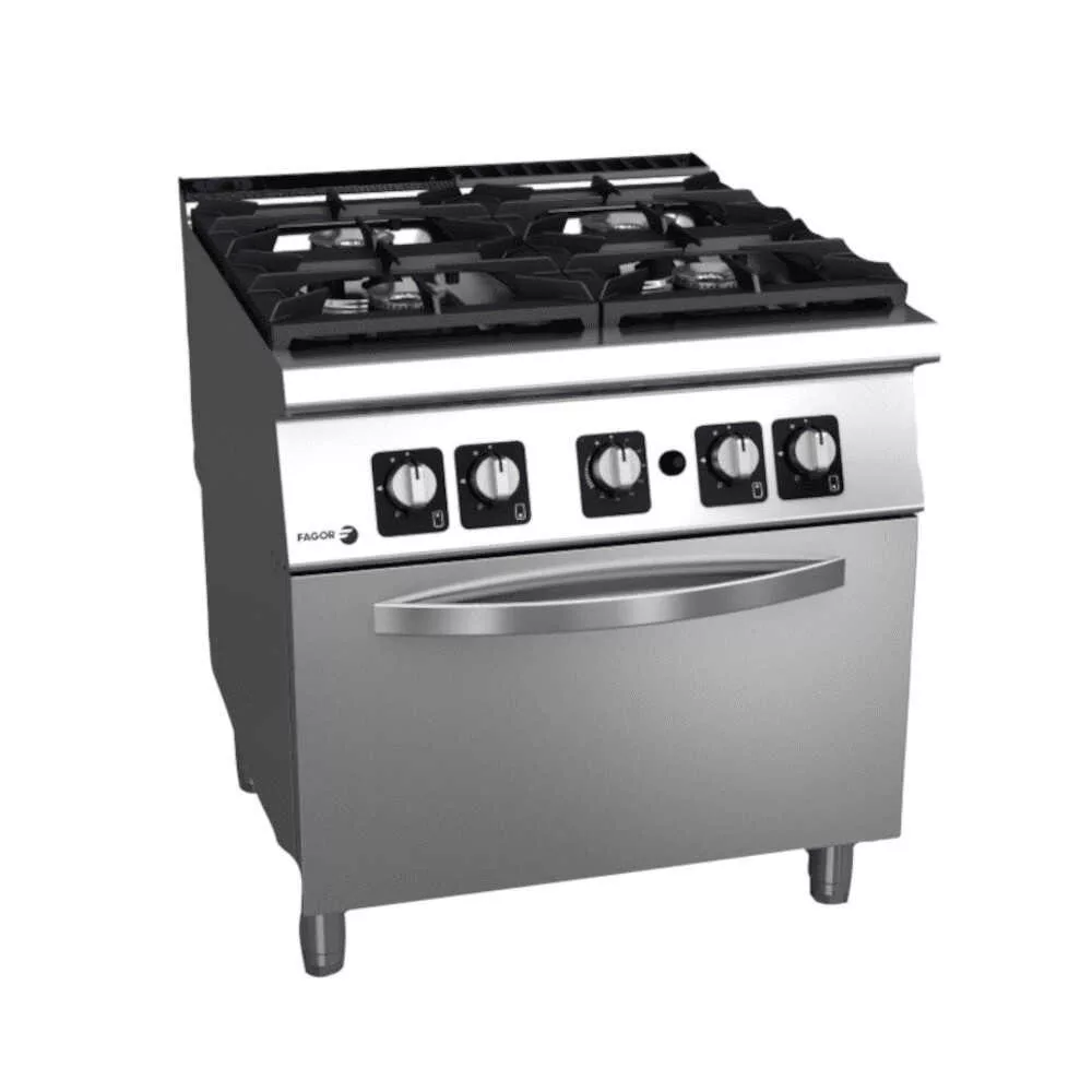Spanyolországban gyártott, rozsdamentes acél kivitelű, gázüzemű asztali ipari tűzhely, 4 rózsás. Öntöttvas edénytartó ráccsal és őrlánggal. Összteljesítmény: 49,4 kW.