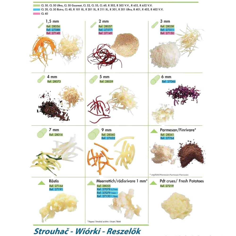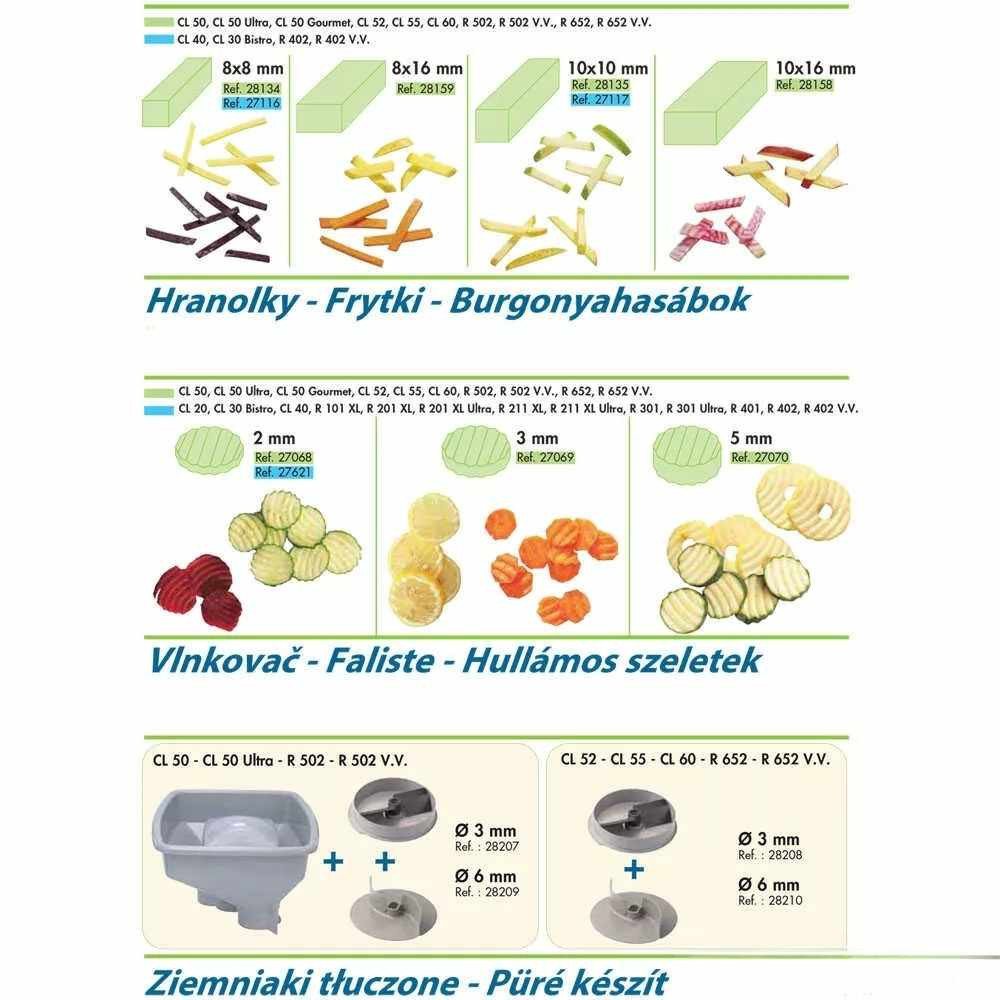A sokféle tárcsa lehetővé teszi az Ön számára, hogy minden gyümölcs-és zöldségfeldolgozási műveletet elvégezzen, amelynek kínálatát a képek között találja meg.