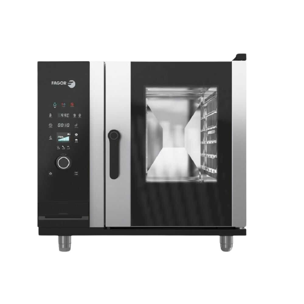 Nagykonyhai használatra tervezett gázüzemű, iKORE sütő, elektromechanikus vezérléssel, DirectSteam, intelligens mosással, 6 db GN 1/1 tálcaférőhellyel.